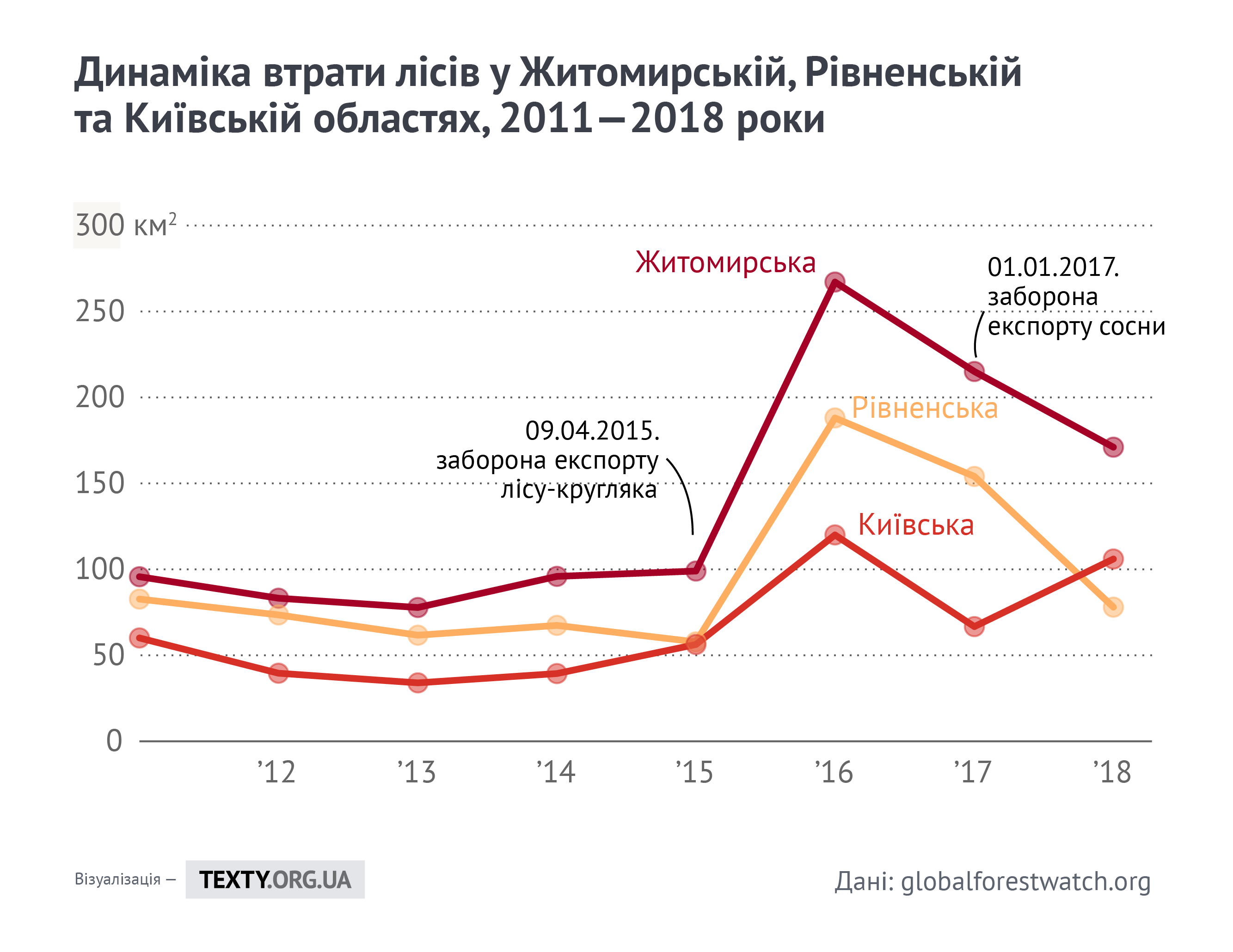 Найцікавіше, що можна побачити на графіку втрат лісового покриву в часі (що вище лінія, то гірше) — це те, наскільки піар щодо «мораторію на вивезення лісу» не відповідає дійсності. Мораторій — це типовий і правильний протекціоністський захід, спрямований на розвиток деревообробної промисловості в Україні, але він не має нічого спільного із захистом лісів. І це видно на графіку. Якраз у 2016 році, після його запровадження, відбулося дуже суттєве (у 3−4 рази для Полісся) збільшення вирубок. Втрати лісів зараз менші, однак вони все одно перевищують рівень 2015 року. Це пояснюється просто: мораторій у 2015—2016 діяв на все, крім сосни, а на Поліссі рубають якраз сосни.