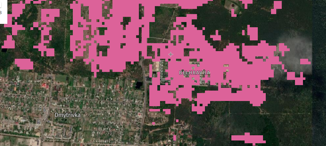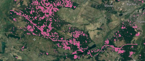 На ділянках, де перетинаються рожевий та синій кольори, система спочатку зафіксувала втрату лісу через рубку, а потім синім лісовідновлення внаслідок створення лісових культур лісгоспом.