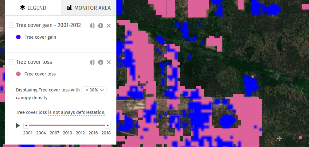 Всесвітня лісова варта (Global Forest Watch, GFW) — це онлайн-система для моніторингу лісів. Цей проект був запущений у 2014 році компанією Google спільно з Інститутом світових ресурсів та ще 40 організаціями.«Tree cover loss» показує щорічні втрати лісового покриву, що визначаються як зміна рівня рослинного покриву понад 5 метрів у межах обраної ділянки.